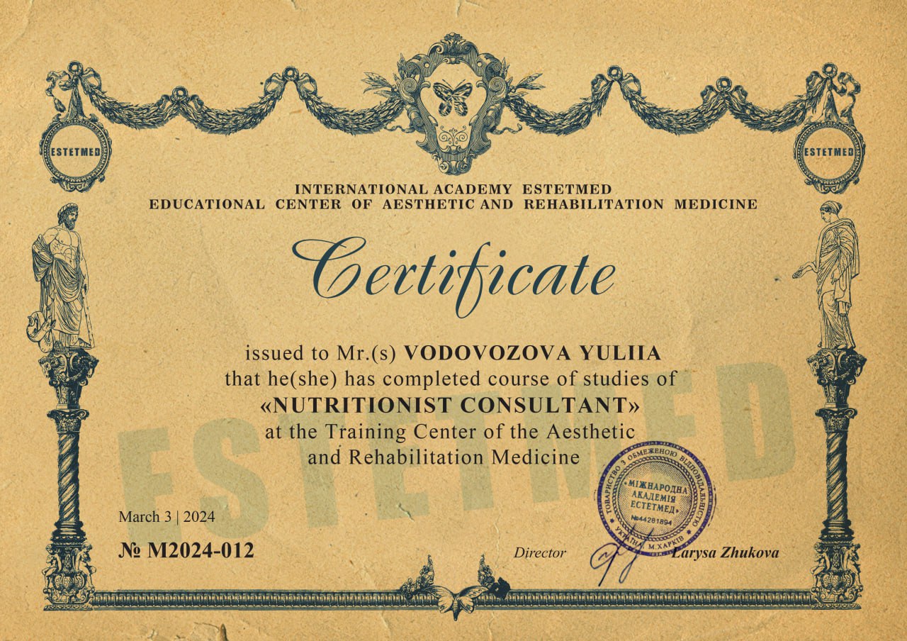 По окончанию курса вы получаете два сертификата: 1. Международной Академии Эстетмед на украинском языке. 2. Сертификат Европейского союза (Венгрия) на английском или на немецком языках, внесенный в реестр образования взрослых